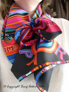 Here I folded the scarf in a basic fold (as best I could for a plisse) to try and get some of the brighter colours to show and I just tied it around the neck twice and pulled out some of the pleats to give this result.